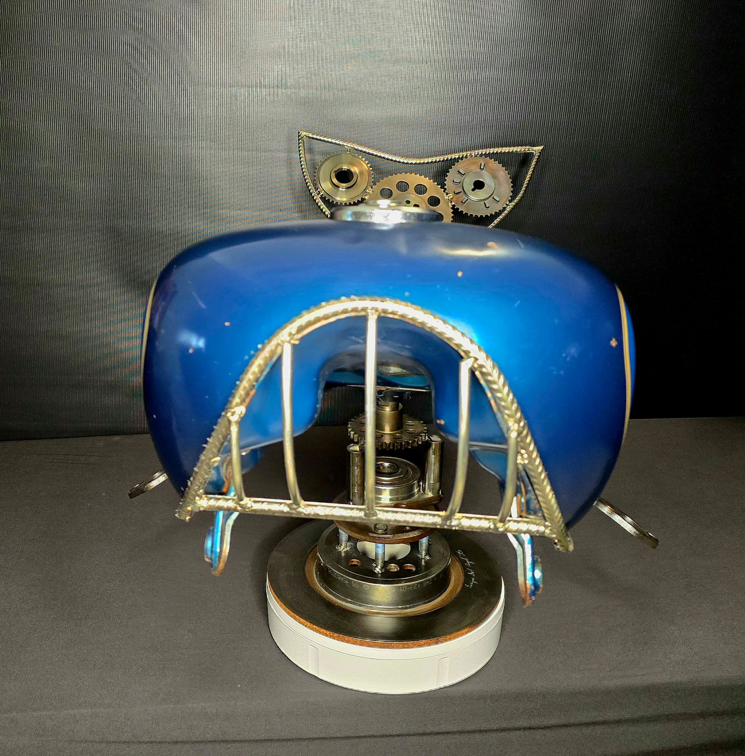 Mounted on a brake rotor base and featuring golden race car components and polished fins that catch the light like a sunrise on chrome, this piece is perfect for car lovers, art collectors, and ocean dreamers alike.