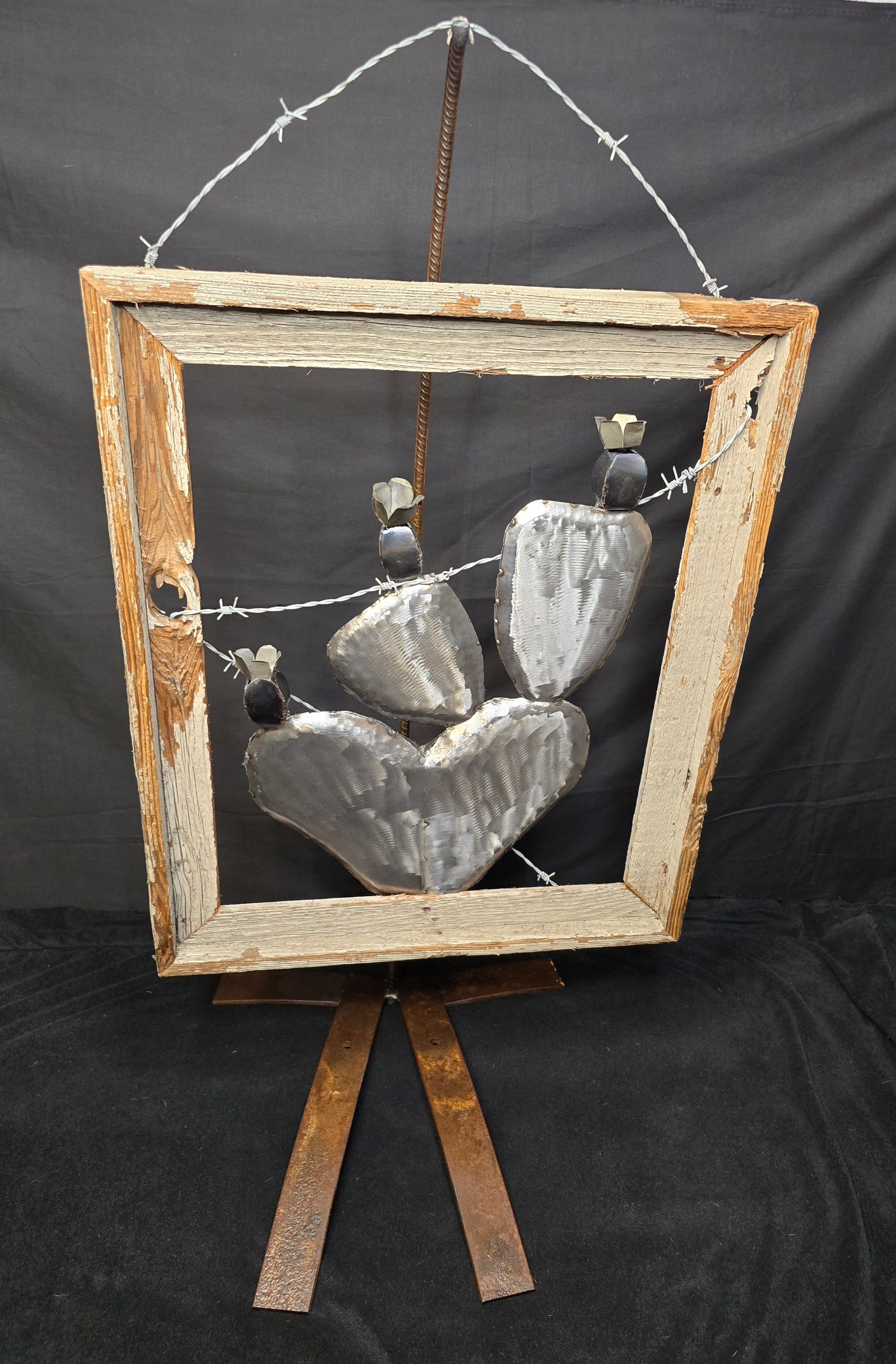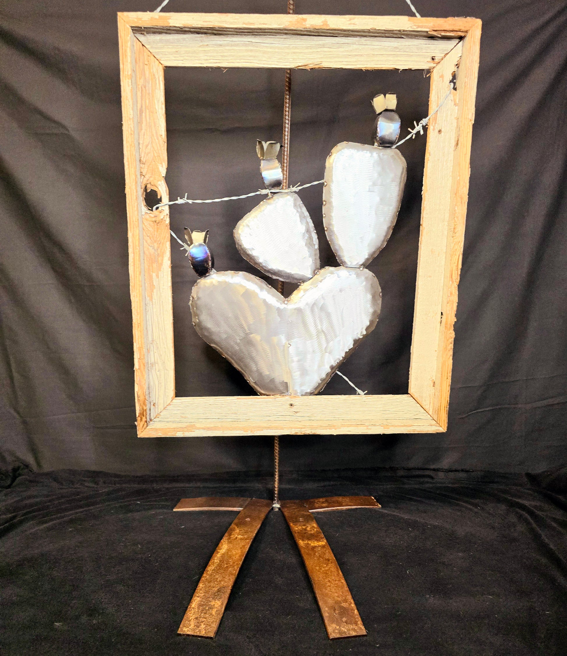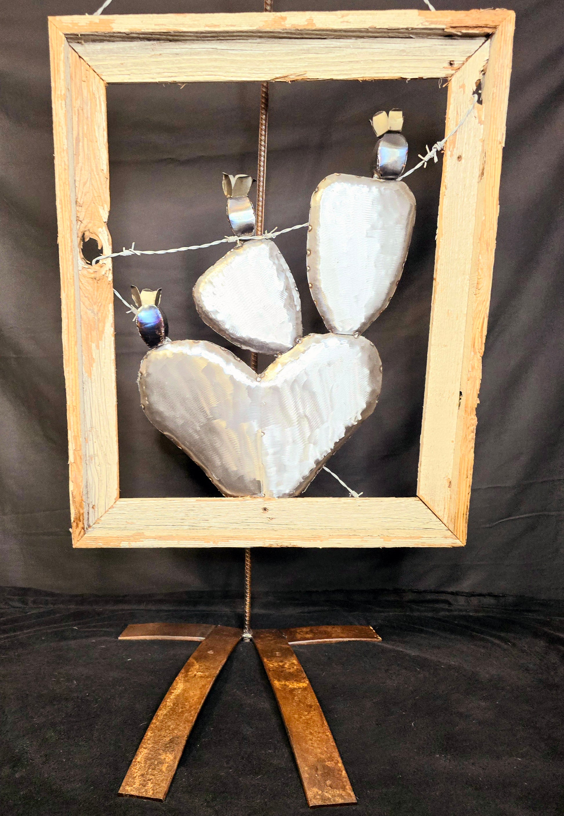 Two cacti, once lost in the desert, found each other and chose to grow as one. United, their forms shaped a heart—rooted in love, resilient through hardship. As they raised their young toward the sun, barbed wire wound around them, symbolizing the trials families endure. Yet together, they rose.