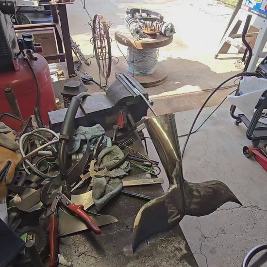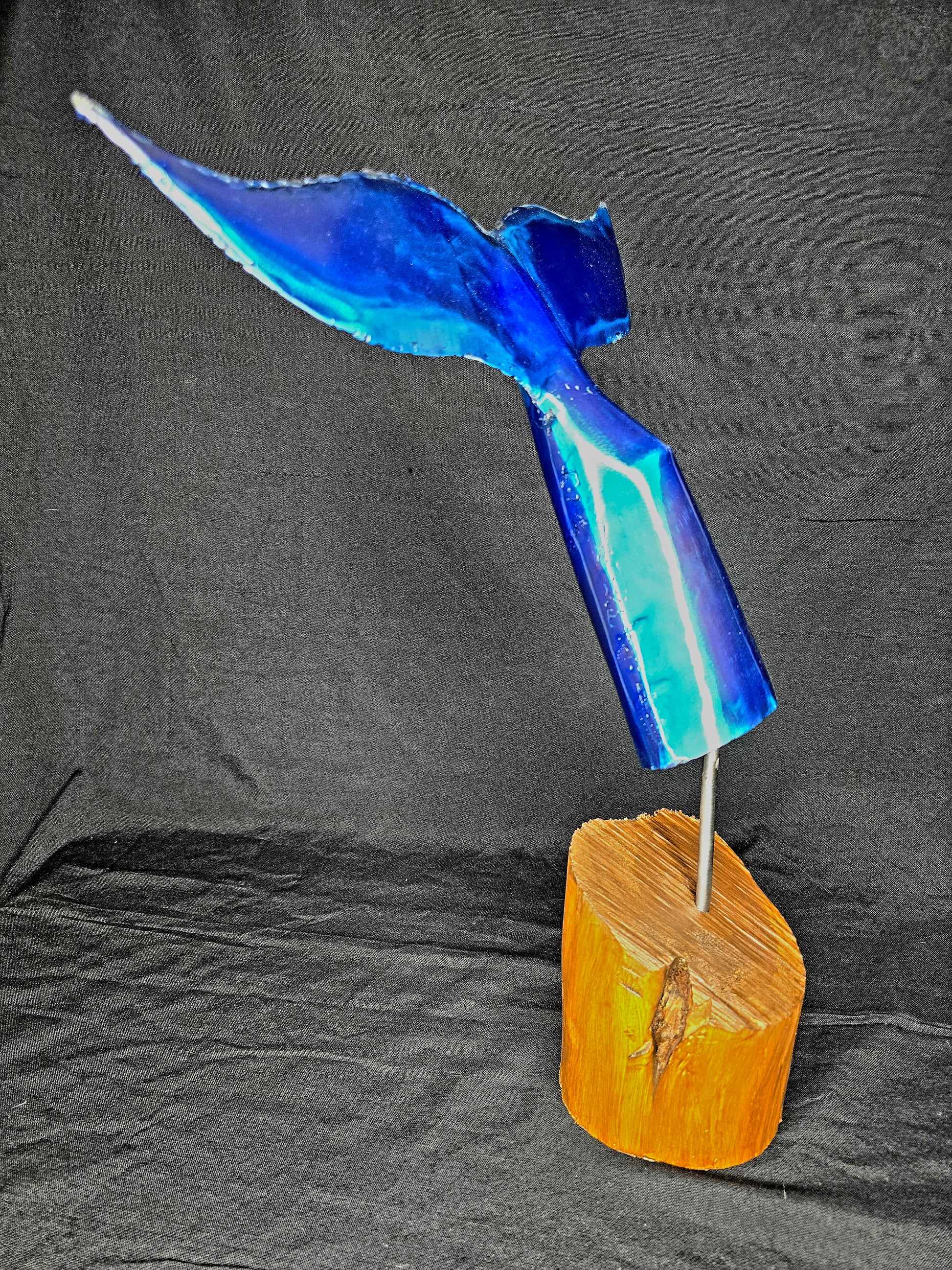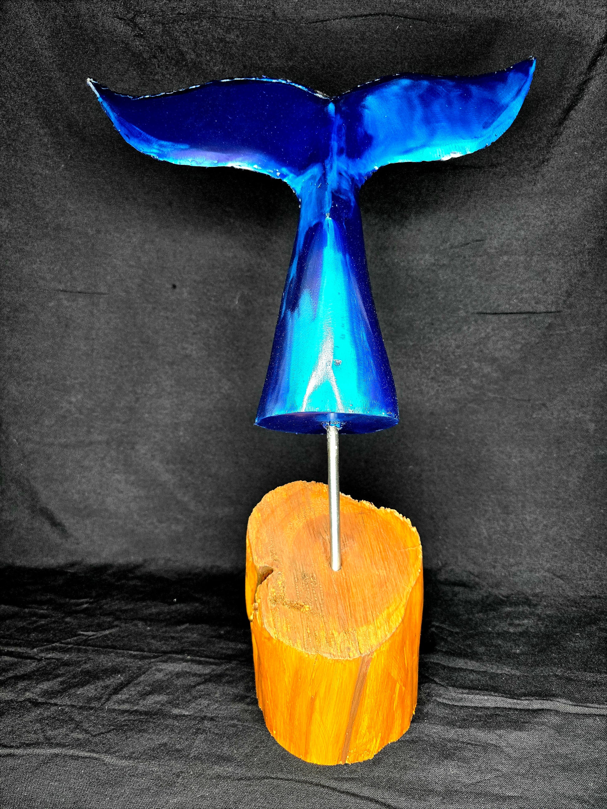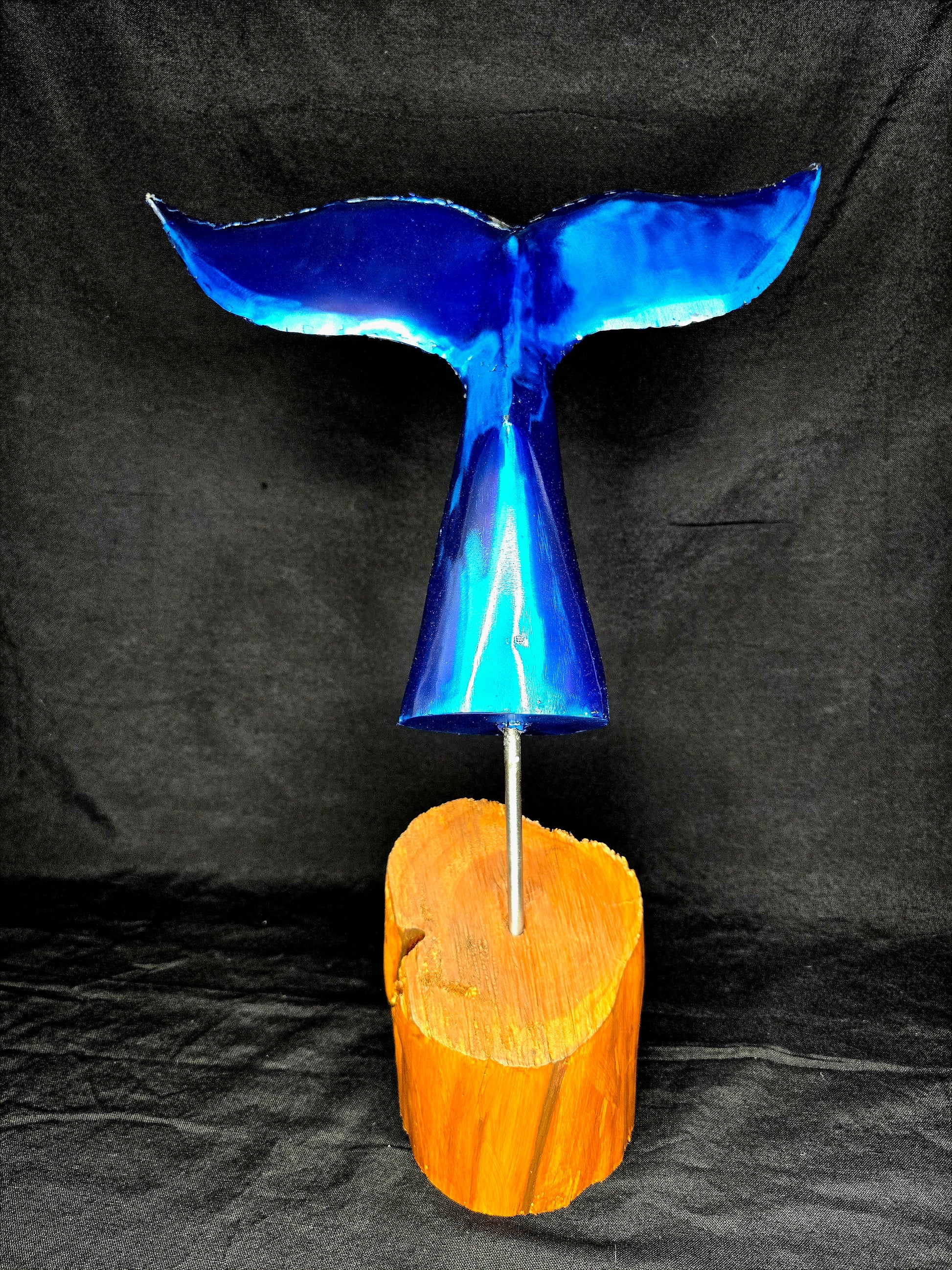 This whale tail is forged from reclaimed sheet metal, a push rod, and mounted on natural Ebano wood—capturing resilience, movement, and the quiet power of the ocean. A reminder that even industrial remnants can return to nature with purpose.
