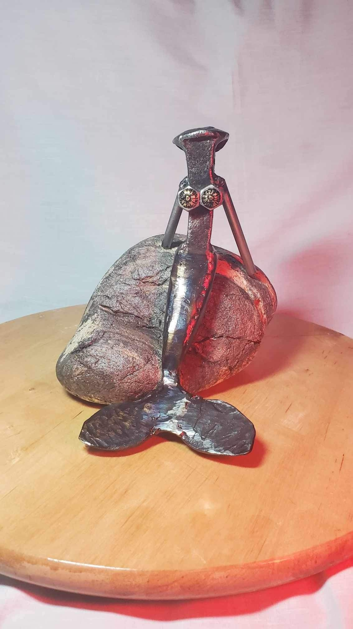 This is a handcrafted metal sculpture of a mermaid. The figure is made from welded metal pieces, railroad spike, and with a minimalistic and rustic design. The mermaid has a distinct tail with hammered and textured details, and her torso is stylized with simple arms and a head. The "bust" features decorative elements resembling small circular embellishments, adding an ornate touch. The sculpture sits atop a natural stone, emphasizing a connection to the sea or nature. The lighting in the photo gives it a warm, reddish tone, enhancing its artistic charm.