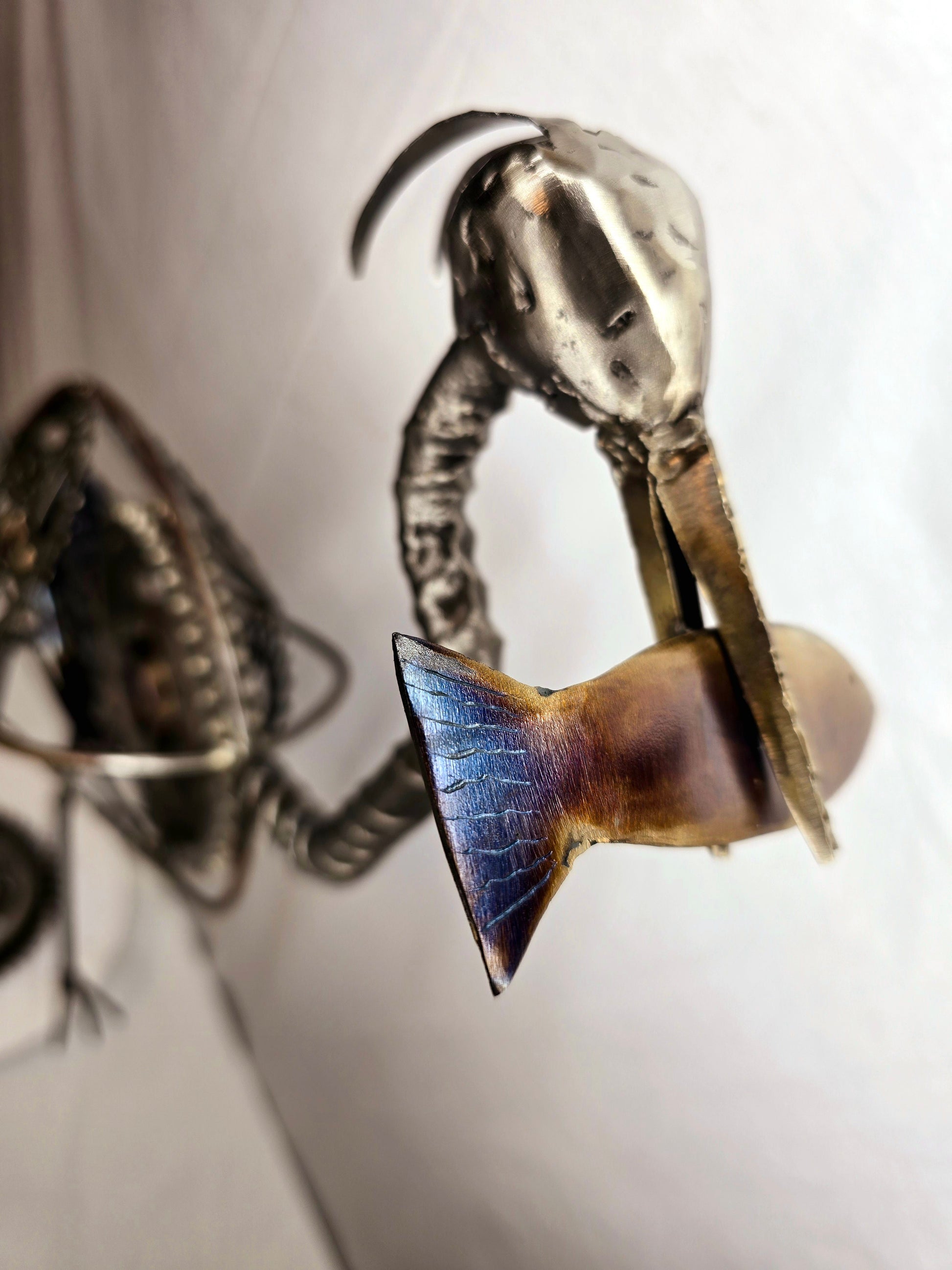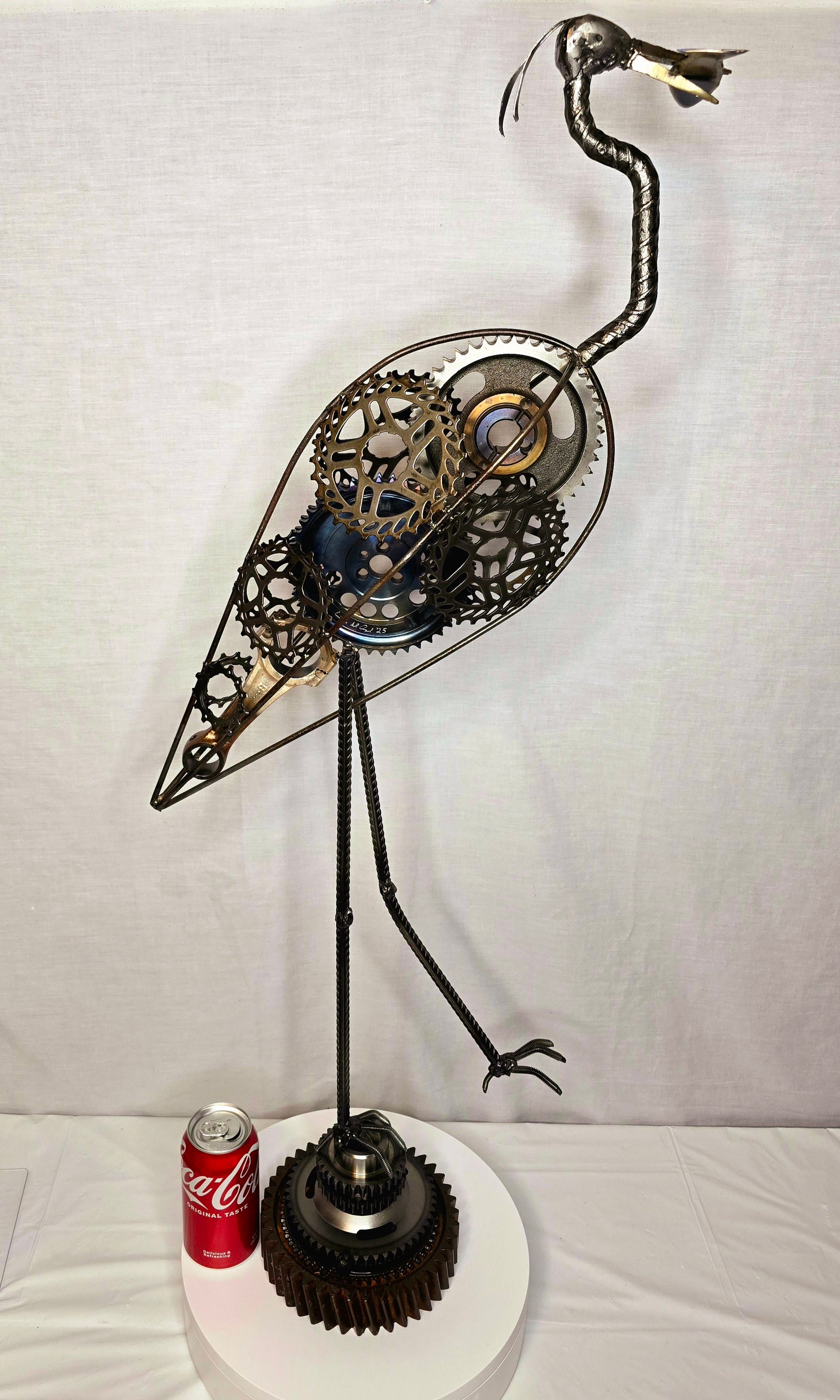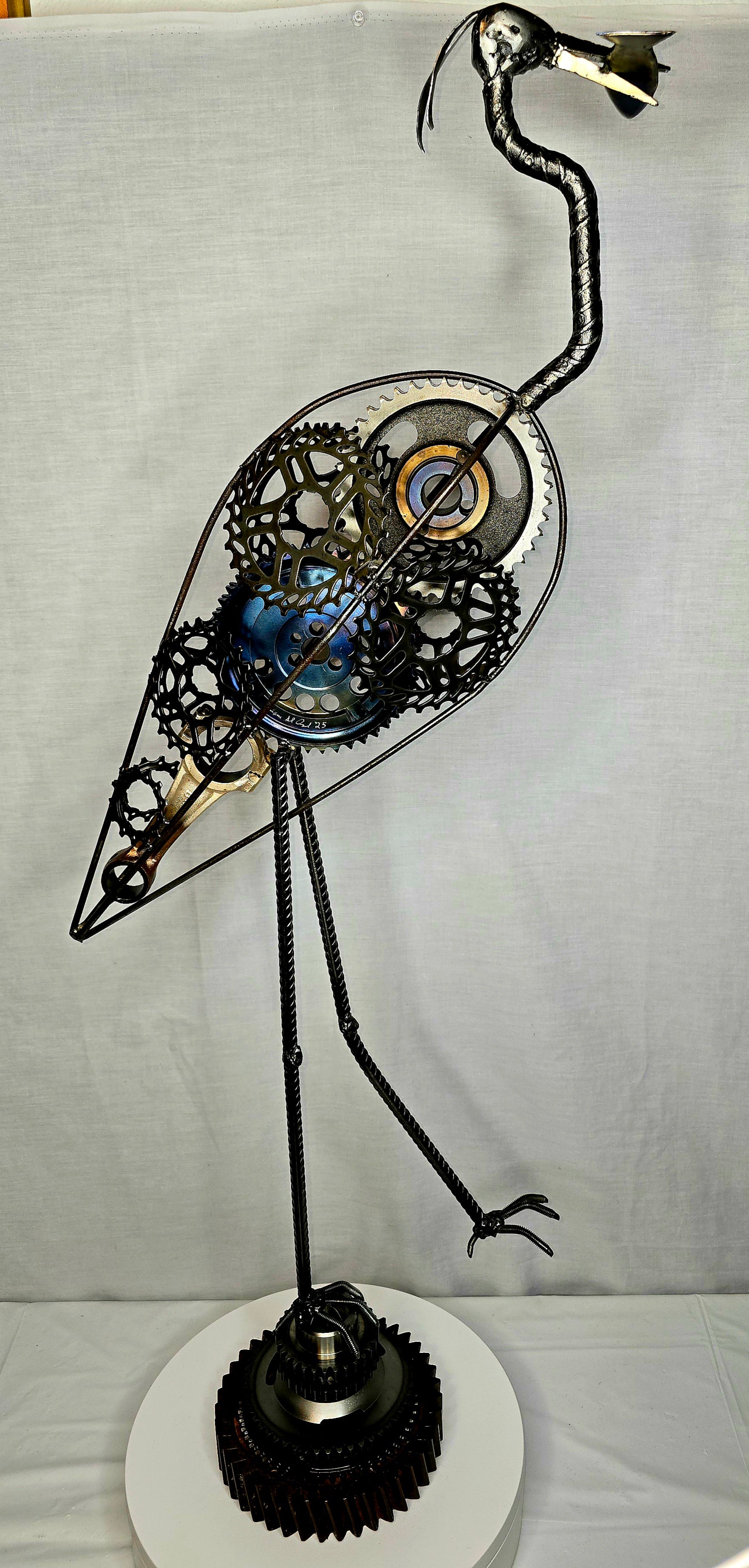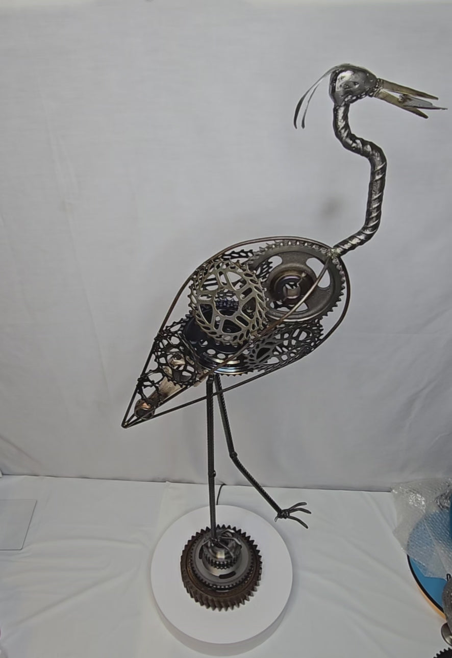 "The Great Blue Heron" — a striking sculpture crafted from reclaimed gears and steel. This graceful bird merges nature with industry, making it a powerful statement piece.
