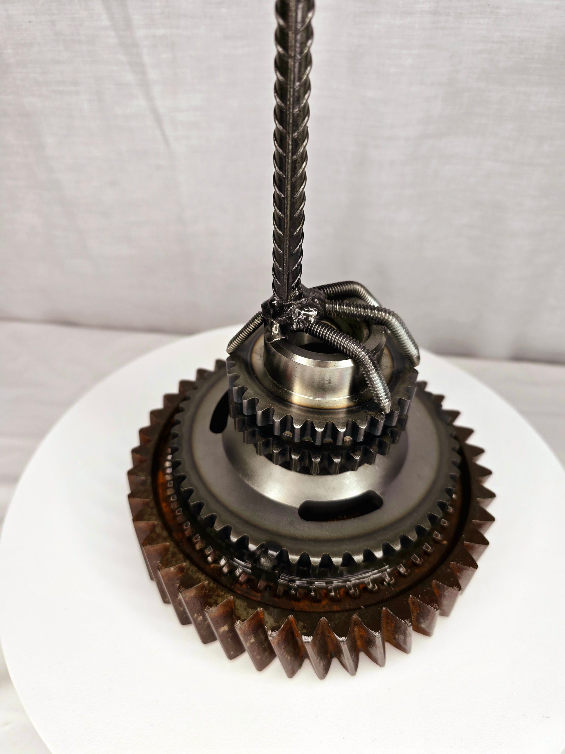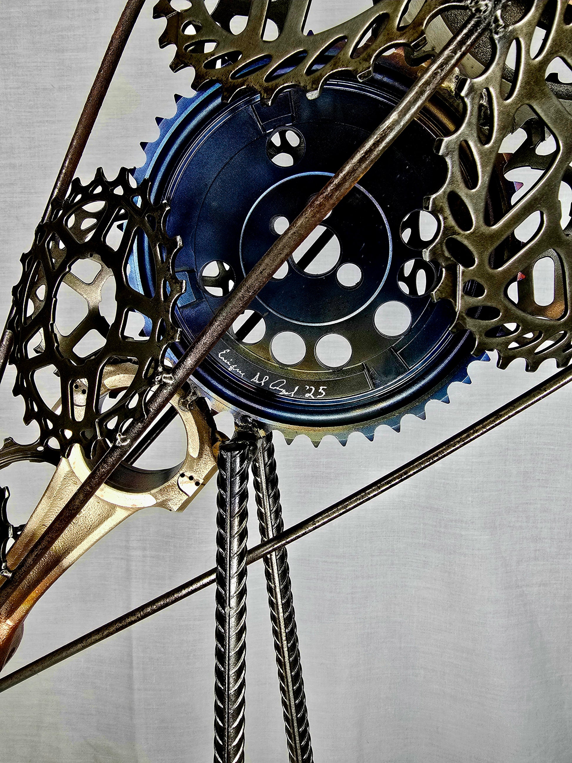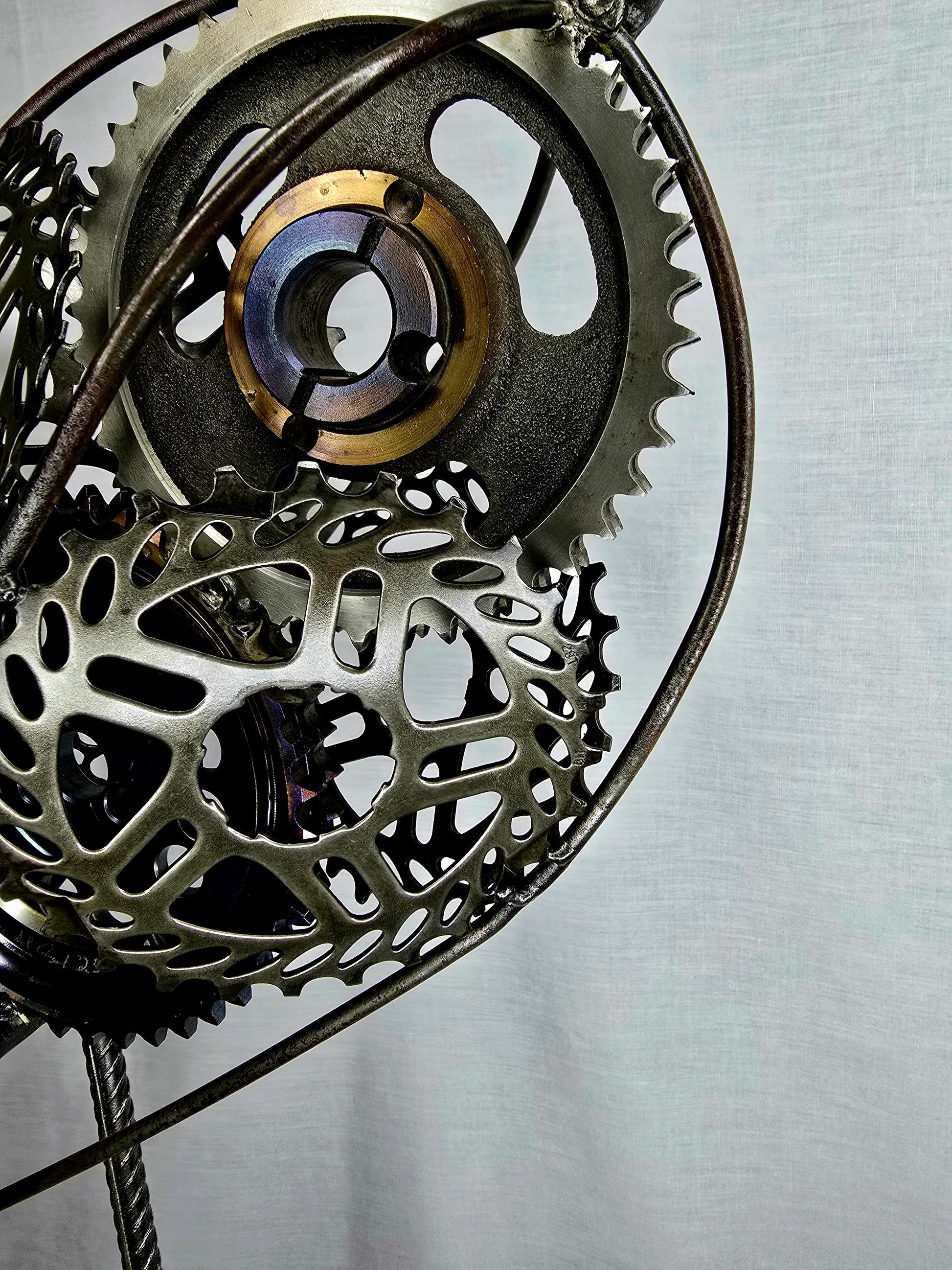 "The Great Blue Heron" — a striking sculpture crafted from reclaimed gears and steel. This graceful bird merges nature with industry, making it a powerful statement piece.