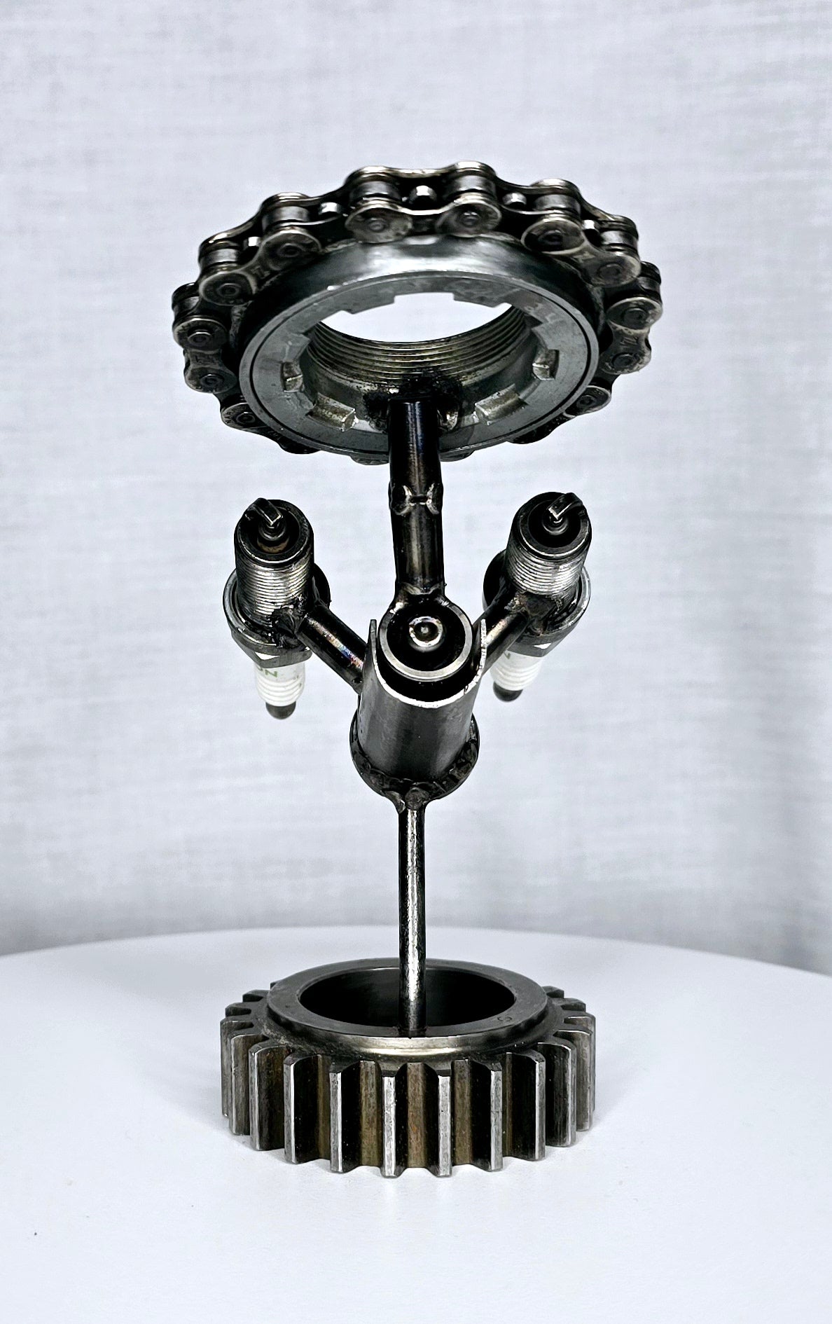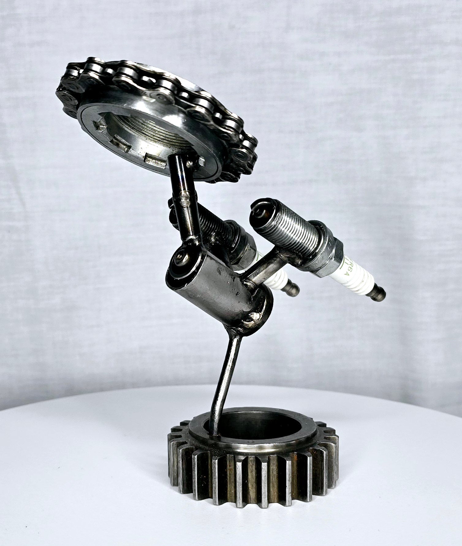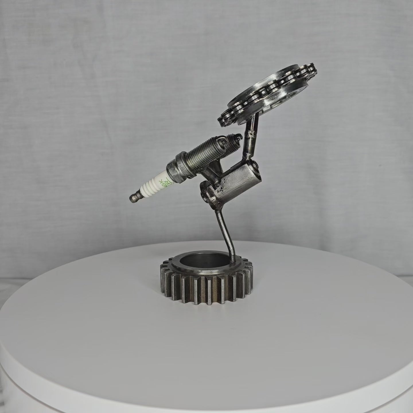 Unleash your inner sci-fi fan with this handcrafted U.S.S. Enterprise-inspired sculpture! Made from repurposed metal parts, including a spark plugs and gear components, this unique piece is both a stunning tribute to Star Trek and a functional fidget spinner. Its industrial design adds a rugged charm, making it a perfect centerpiece for your desk, shelf, or workspace. Whether you're a collector, a fan of futuristic art, or simply looking for a fun and functional conversation starter, this one-of-a-kind sculpture is sure to engage and impress. Claim this blend of art, engineering, and play today!