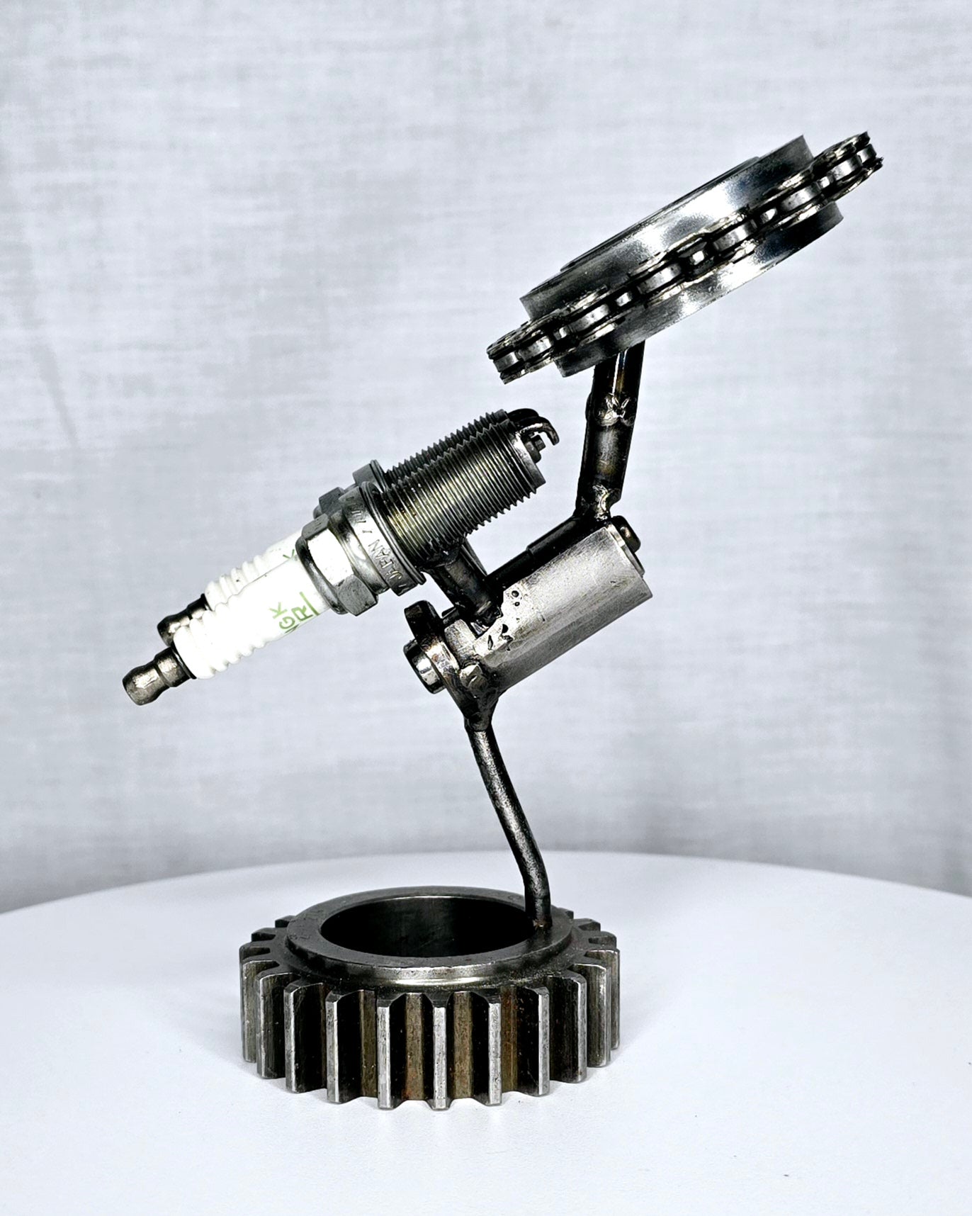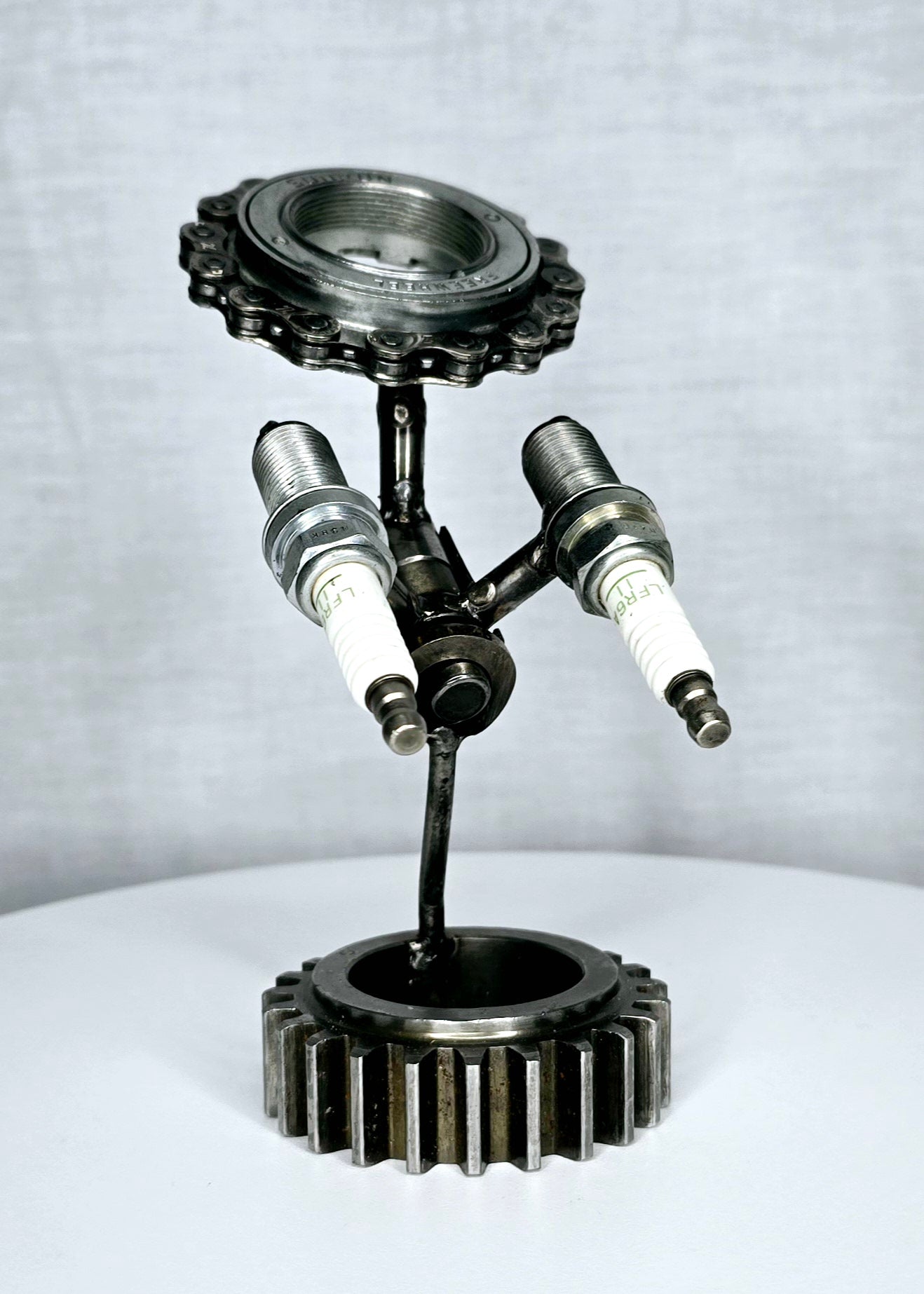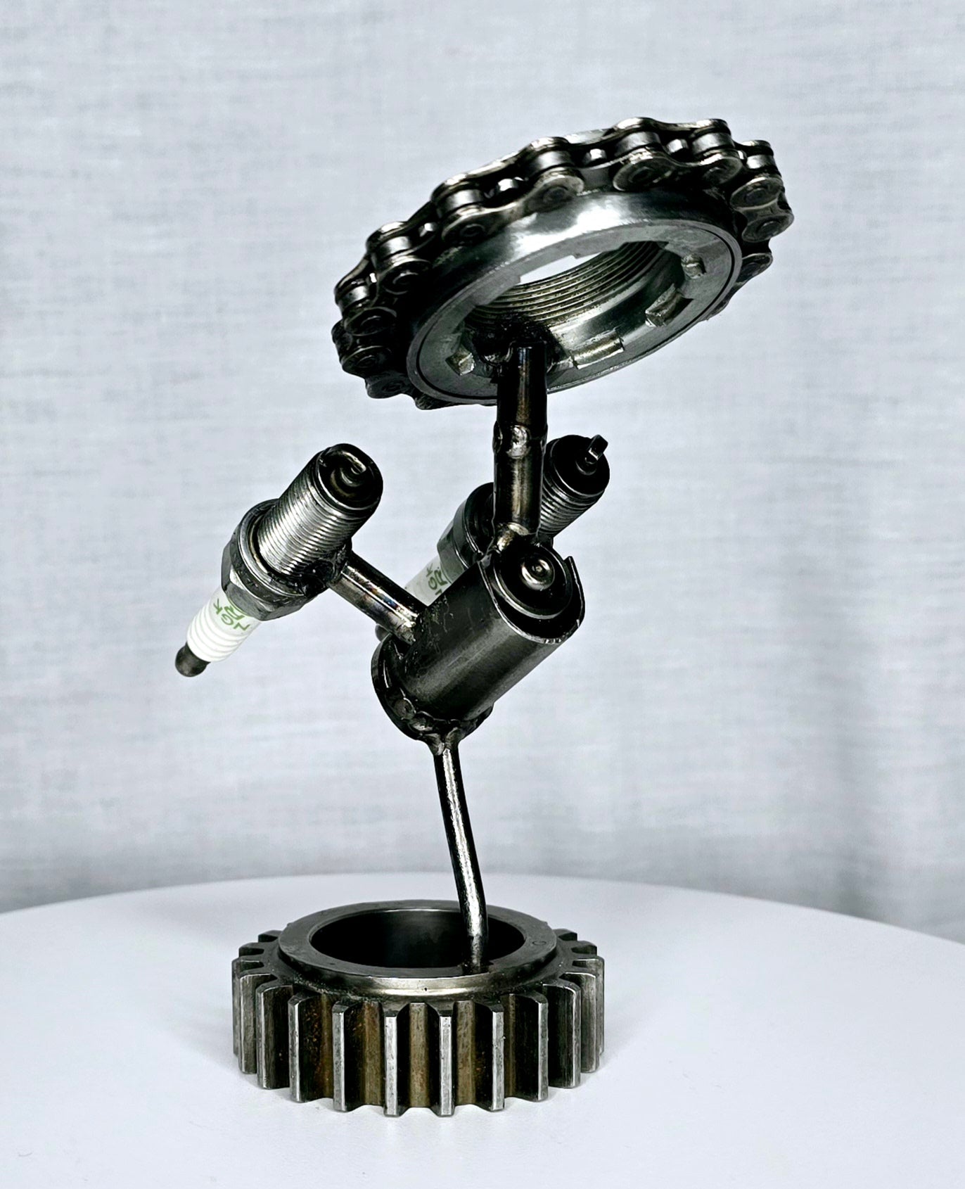 Unleash your inner sci-fi fan with this handcrafted U.S.S. Enterprise-inspired sculpture! Made from repurposed metal parts, including a spark plugs and gear components, this unique piece is both a stunning tribute to Star Trek and a functional fidget spinner. Its industrial design adds a rugged charm, making it a perfect centerpiece for your desk, shelf, or workspace. Whether you're a collector, a fan of futuristic art, or simply looking for a fun and functional conversation starter, this one-of-a-kind sculpture is sure to engage and impress. Claim this blend of art, engineering, and play today!