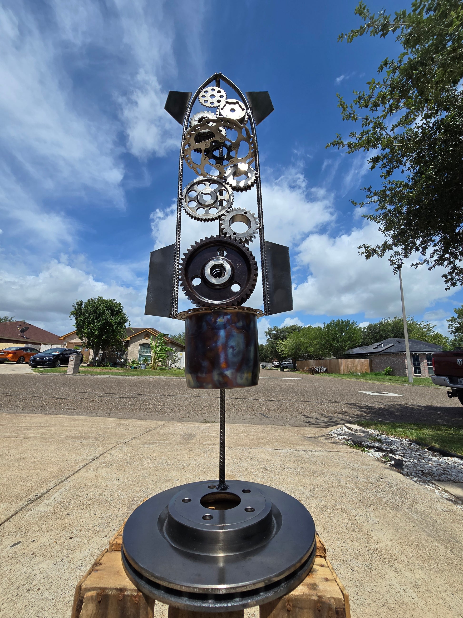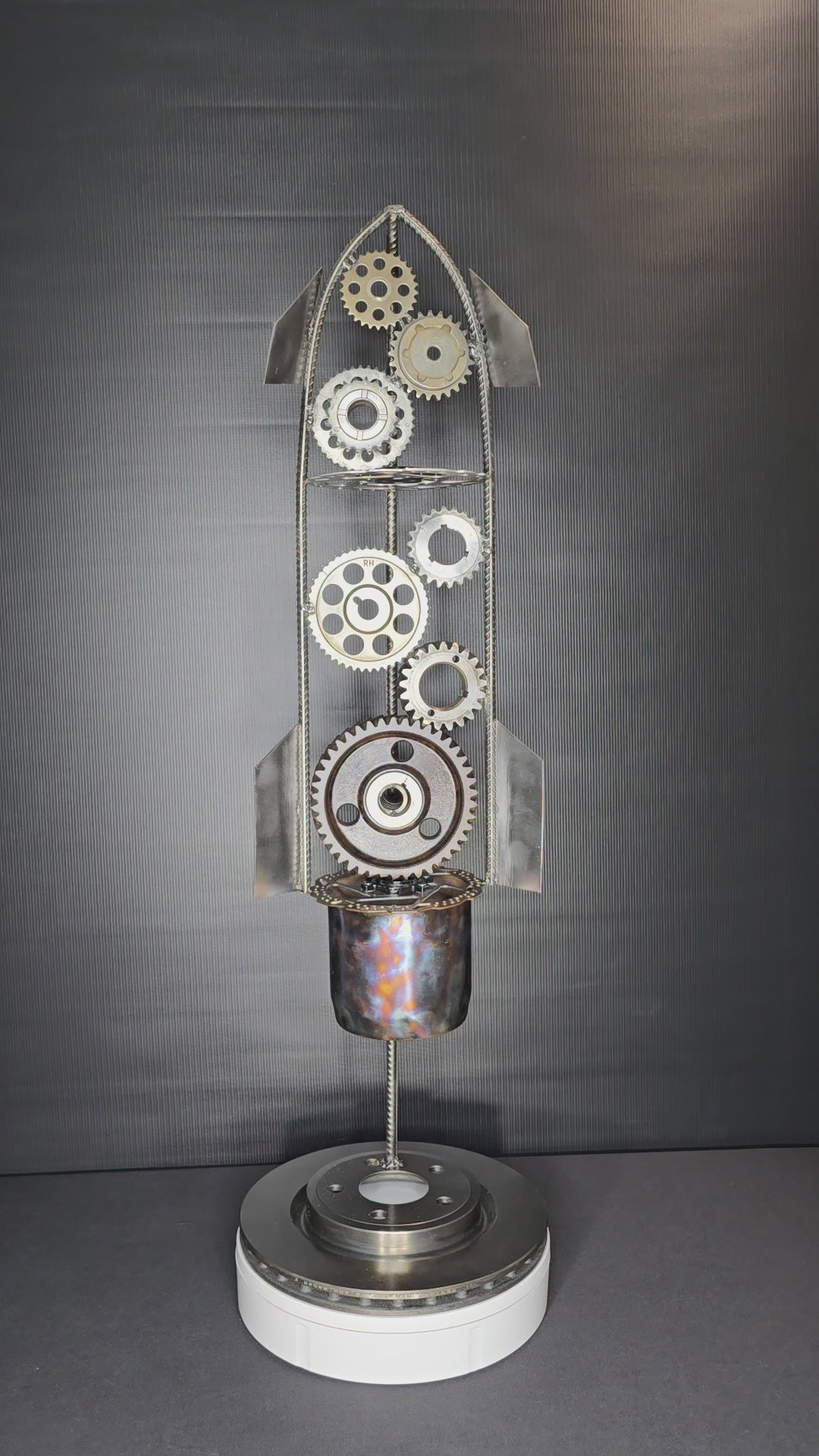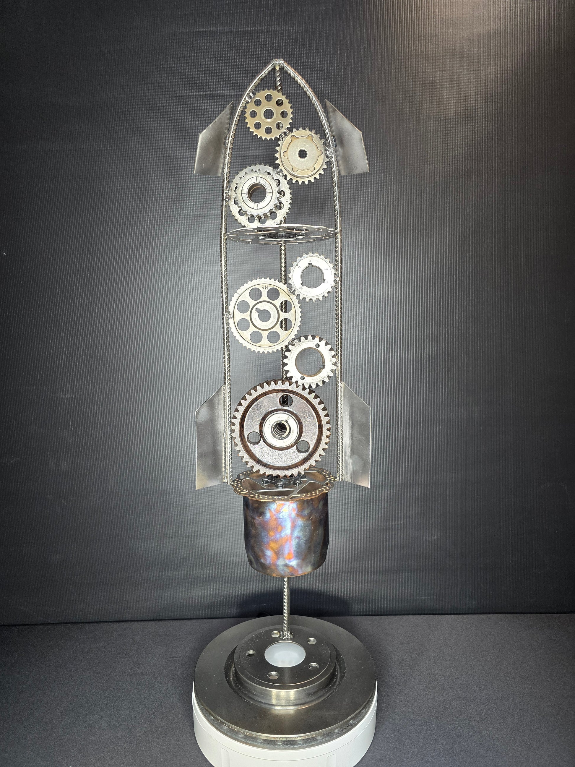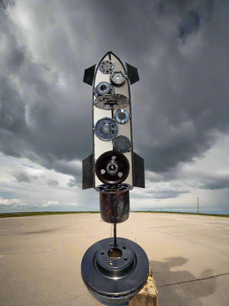 Let your spirit soar beyond the stratosphere with this striking metal rocket by Del Angel Garage: Metal Art. Forged from reclaimed gears and steel, each intricate piece whispers tales of motion, ambition, and the quiet hum of possibility.