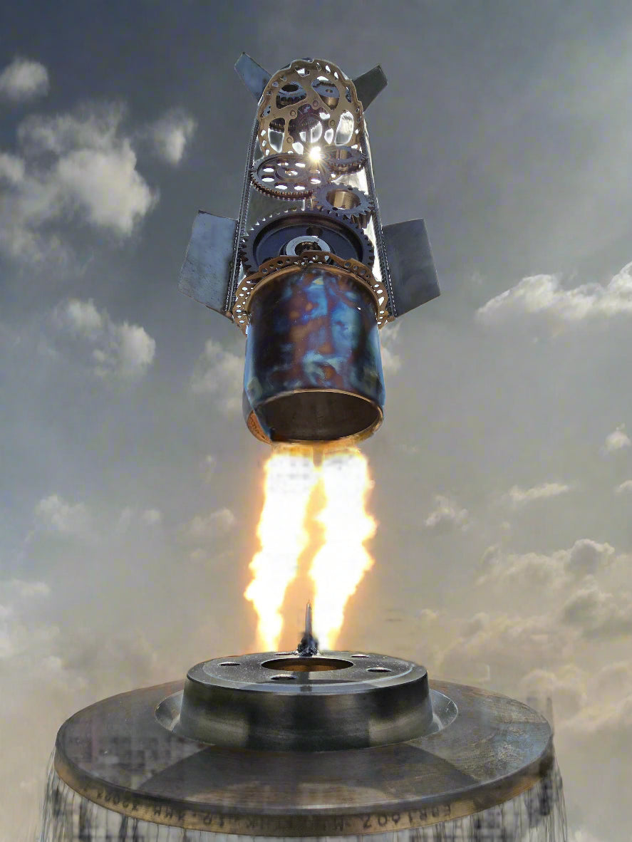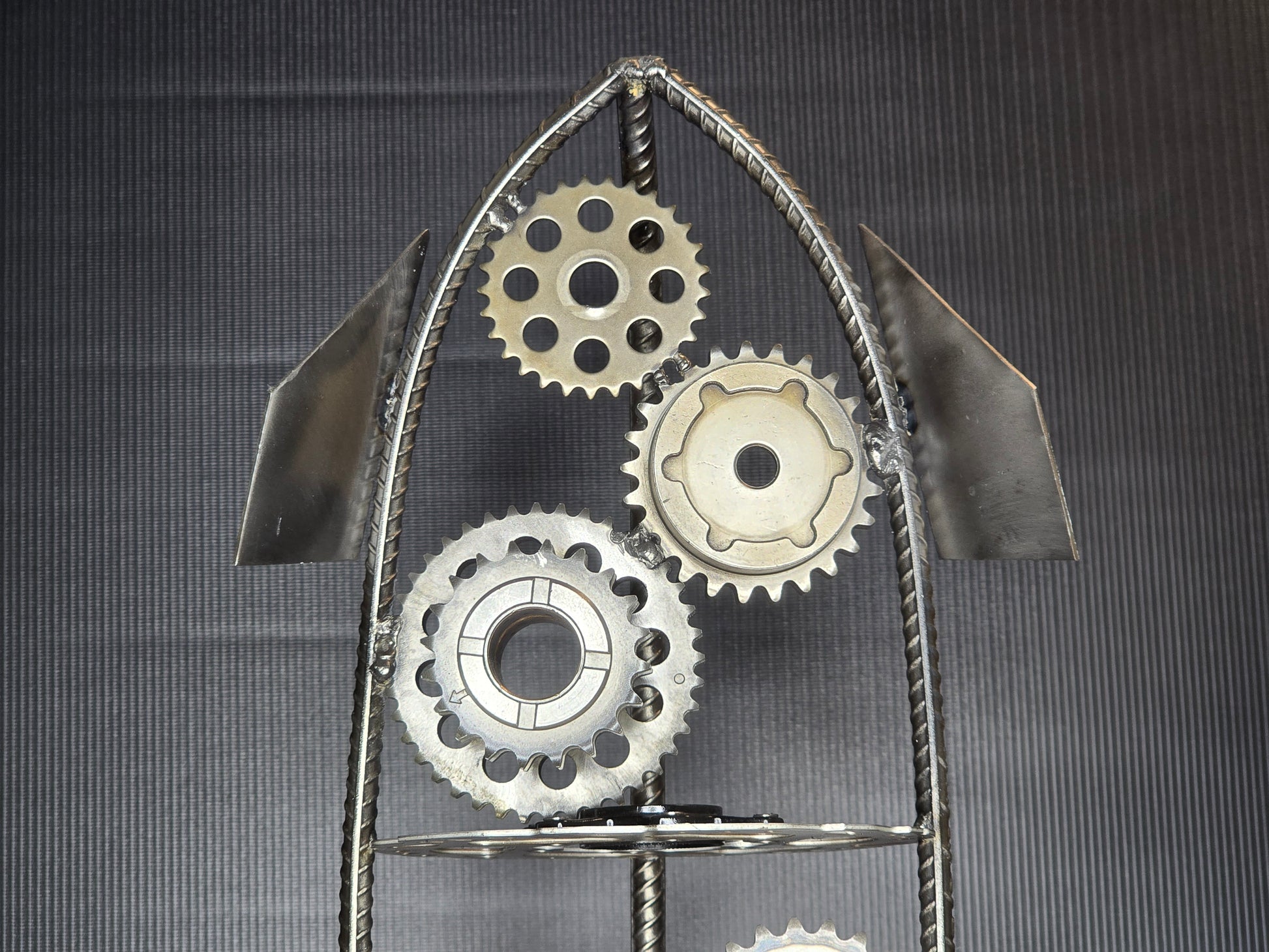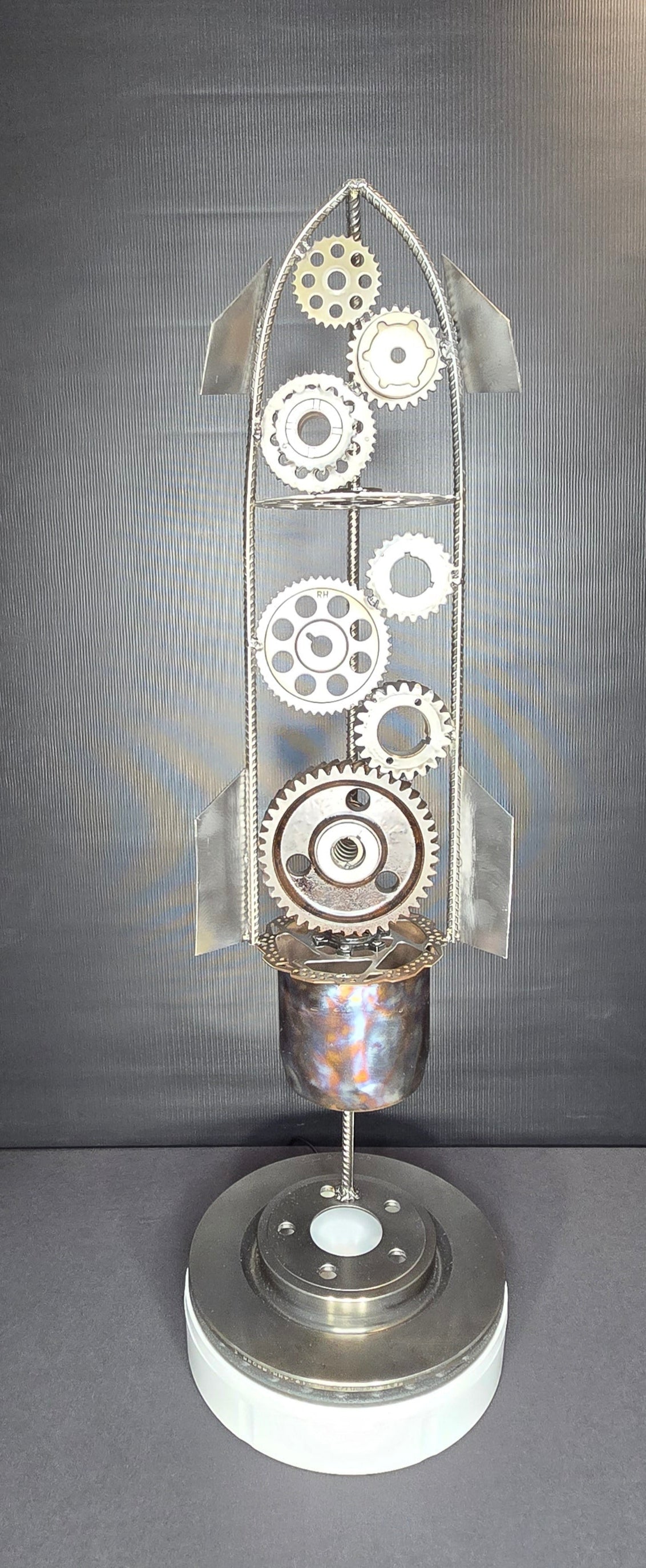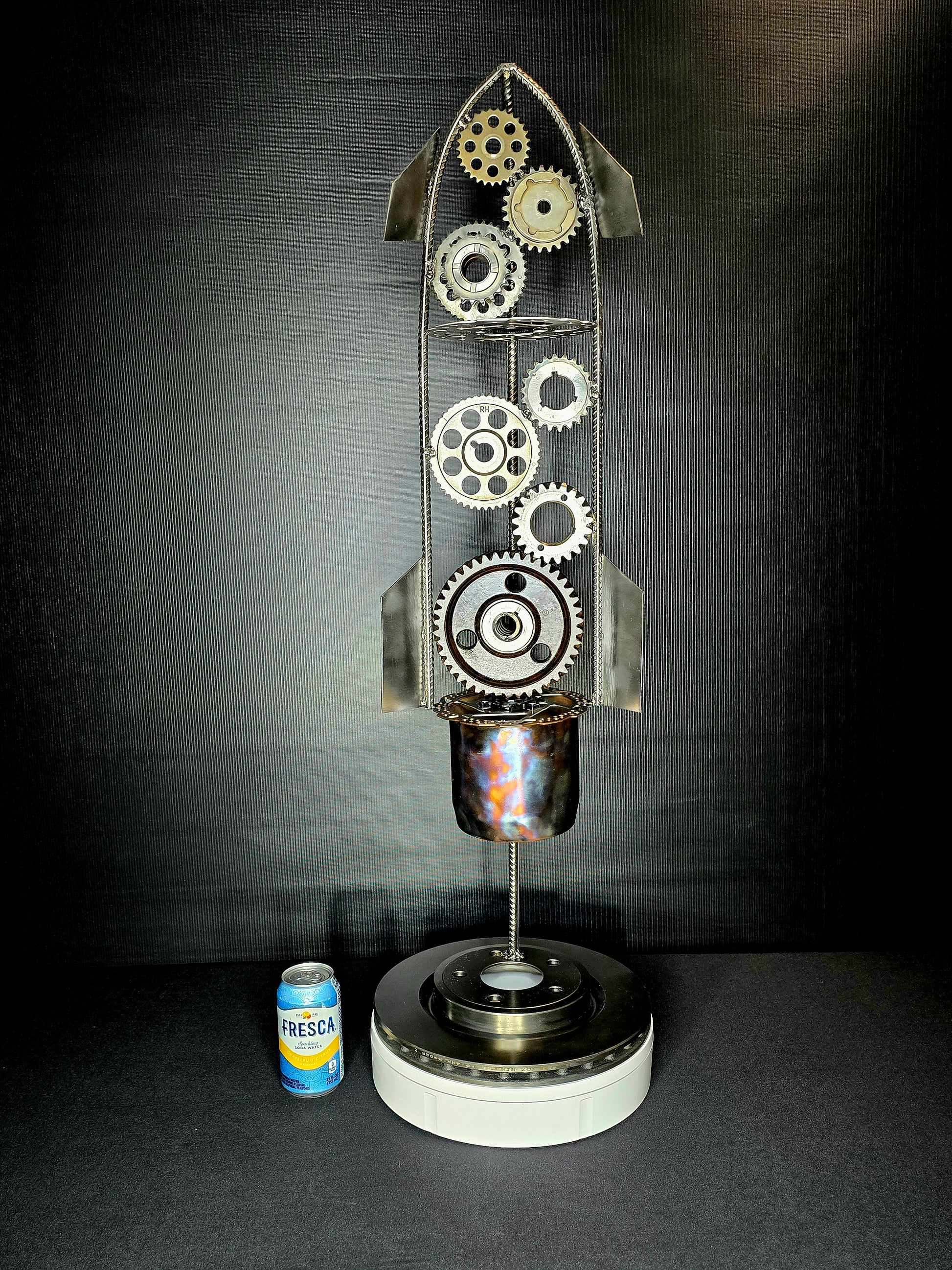 Let your spirit soar beyond the stratosphere with this striking metal rocket by Del Angel Garage: Metal Art. Forged from reclaimed gears and steel, each intricate piece whispers tales of motion, ambition, and the quiet hum of possibility.